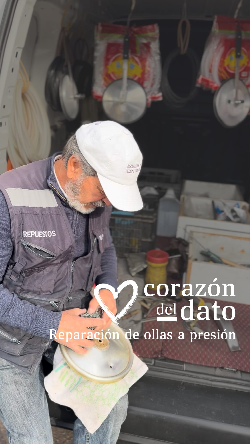 Hace reparación, mantención, cambio de gomas, válvulas de seguridad, pitos y también enseña cómo usar la olla para evitar accidentes. Él recoge las ollas, las repara en su camioneta y las entrega en el momento.